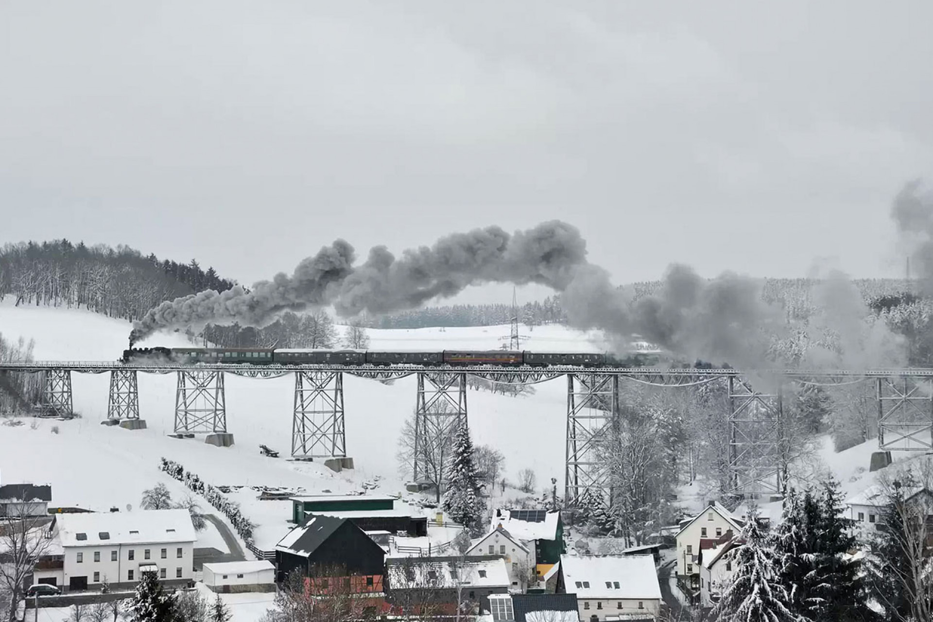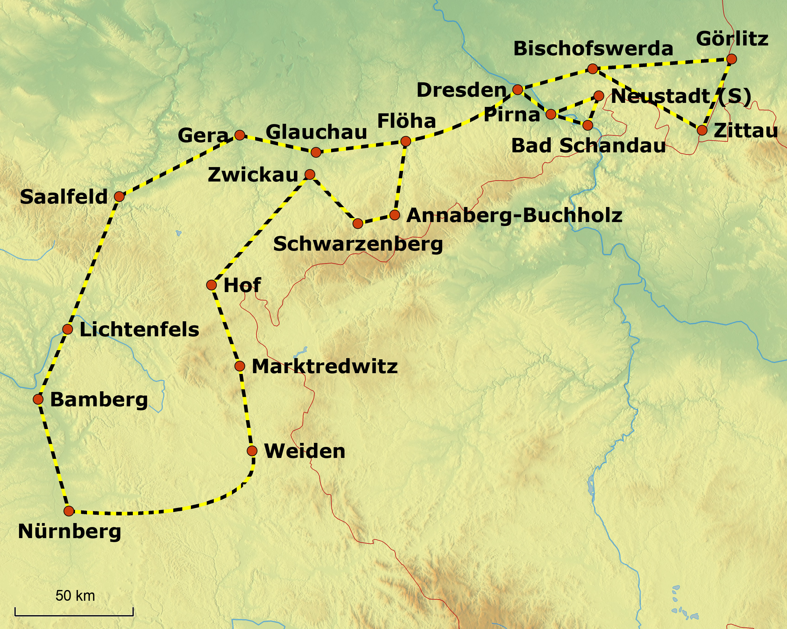 4 Tage Volldampf mit den Dampflokomotiven 23 058, 23 1097, 86 1333, 86 1744 und 52 8141 durch die Oberpfalz, das Vogtland, das Erzgebirge, das Lausitzer Bergland, dem Elbsandsteingebirge, dem Thüringer Holzland und dem Frankenwald. Zentrale Übernachtung in Dresden.