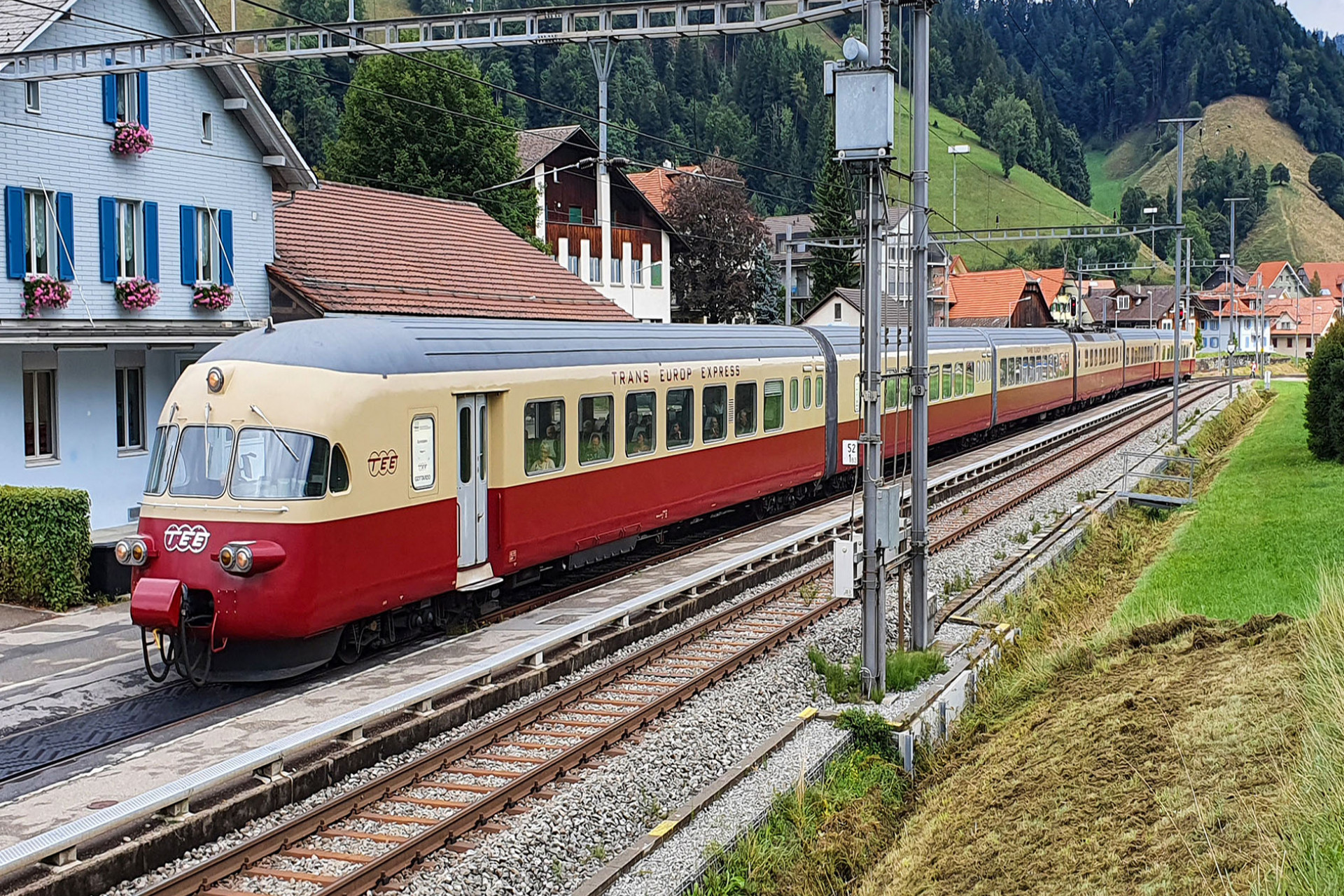 Dreitägige exklusive 1.Klasse-Charterfahrt im Trans-Europa-Express RAe1053 der SBB Historic von Basel auf unterschiedlichen Strecken der Nordschweiz via Gotthard-Bergstrecke nach Lugano am gleichnamigen See und zurück inklusive 2x Mittagsmenü im TEE.